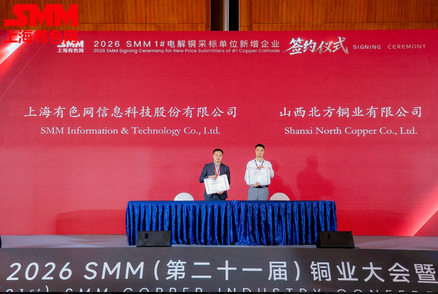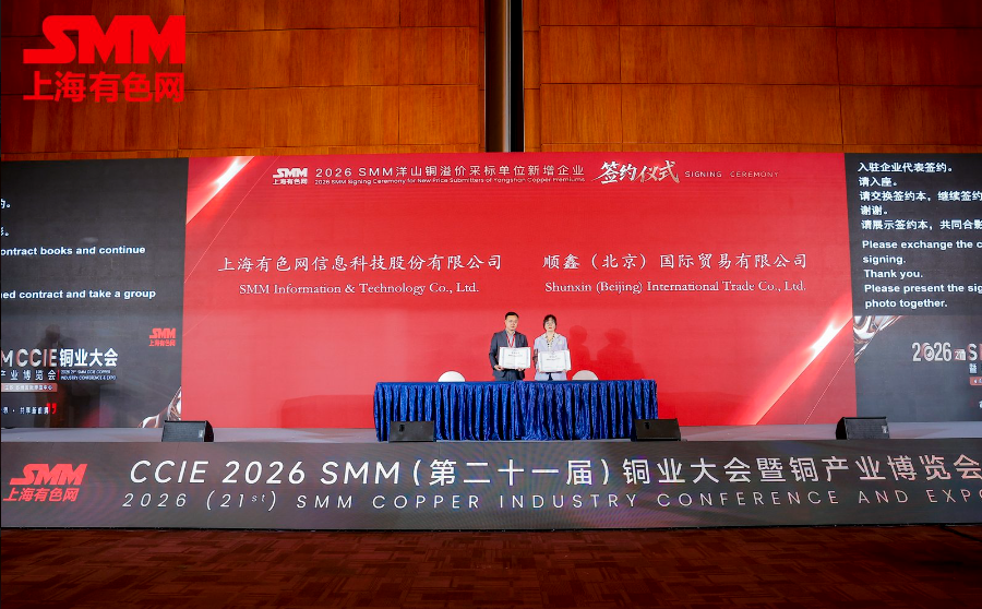 为进一步服务洋山铜市场上下游企业,提升价格透明度与公允性,SMM 依据洋山铜溢价报价方法论,并严格遵循 IOSCO 相关标准,定期对洋山铜溢价采标单位开展评估并组织授牌签约。2026 年度 SMM 洋山铜溢价新增采标单位为:顺鑫(北京)国际贸易有限公司。SMM 大数据总监叶建华与新增企业代表在会议现场完成签约。