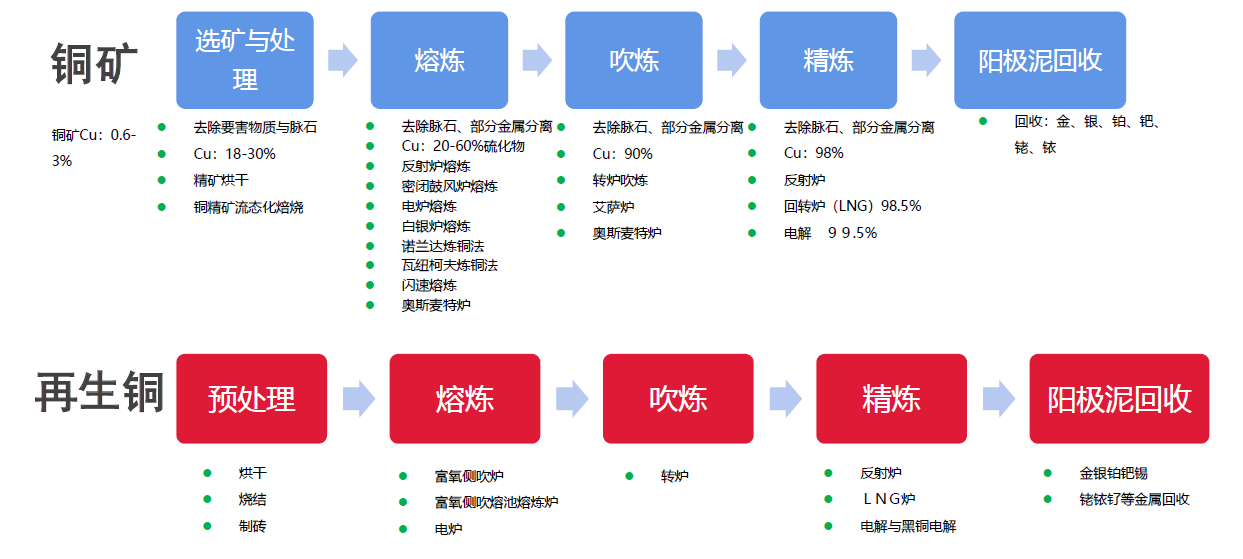间接利用(流向冶炼端):部分废杂铜需作为铜精矿的替代品,需要经过熔炼处理成电解铜后供用户使用, 称为再生冶炼。